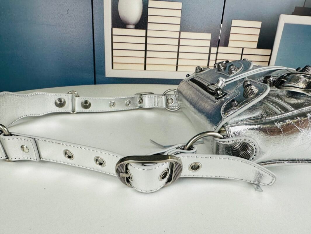 BALENCIAGA Paris Le Cagole🖤|||Where are Jay Chou's fans🙌 Le cagole camera motorcycle flap bag [wax black/grey]📷 There are not many men's bags with such a sense of design. The square flap design with rivet hardware is very punk🎸. The waxed leather burst texture makes the physical object extremely good-looking[golden potato R][golden potato R]. The adjustable woven shoulder strap has additional eyelets and an external leather card case. The classic little heart mirror in the past has been replaced by an AirPods holder🎧. It's simply amazing!!! It is directly a gospel for headset enthusiasts[drinking milk tea R][drinking milk tea R]. [side eye R][side eye R] Vertical style and new horizontal style, suitable for both men and women. ❥The horizontal wax black is so popular that it is often out of stock💥. Size 24x11x6, model number.