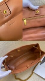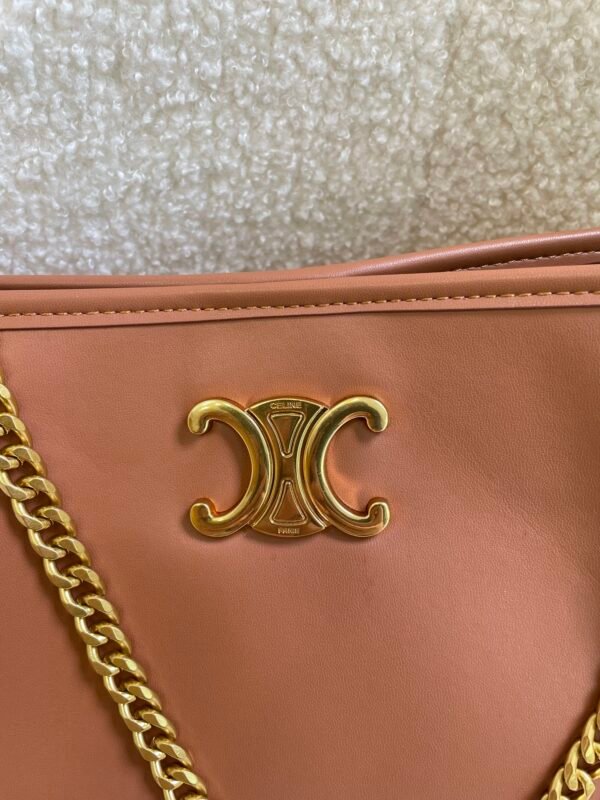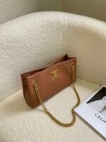 The newly released Victoire chain bag is crafted with textured leather to create a square silhouette and is paired with a golden sliding chain shoulder strap, exuding the style of a Tomboy cool girl. Another Tily handbag features a playful crescent silhouette that sets off the Triomphe emblem, revealing the sweet charm of a girl next door. The Triopmhe metal Triomphe emblem remains the visual focus. The newly released Victoire chain bag uses textured calfskin to create a soft bag shape, replacing the hard and sharp line structure, making it more relaxed and friendly. The metal sliding chain shoulder strap can achieve different styles such as shoulder carrying and crossbody carrying. The bag can freely switch between casual and formal scenes. Style number: 810524 Size: 9X6X3 inches (23.5X14X8 cm). Crossbody and shoulder carry. TRIOMPHE snap closure. 2 main compartments and 1 inner flat pocket. Sliding chain.