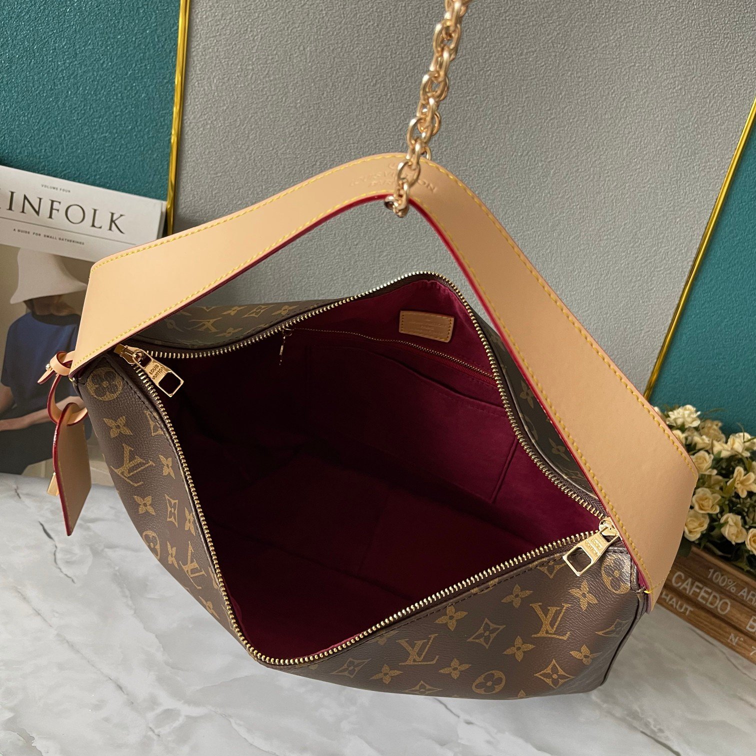 Upgraded version. M12098 new model. Exclusive real-shot background [Graceful shopping bag]. Graceful shopping bag with old flower pattern. Original monogram canvas texture. Exquisite pattern matching. Fashionable and western style. Suitable for mixing and matching various styles. Lightweight and with a super large capacity design. Lightweight and practical. Size: 41.0 × 33.0 × 10.0 cm.