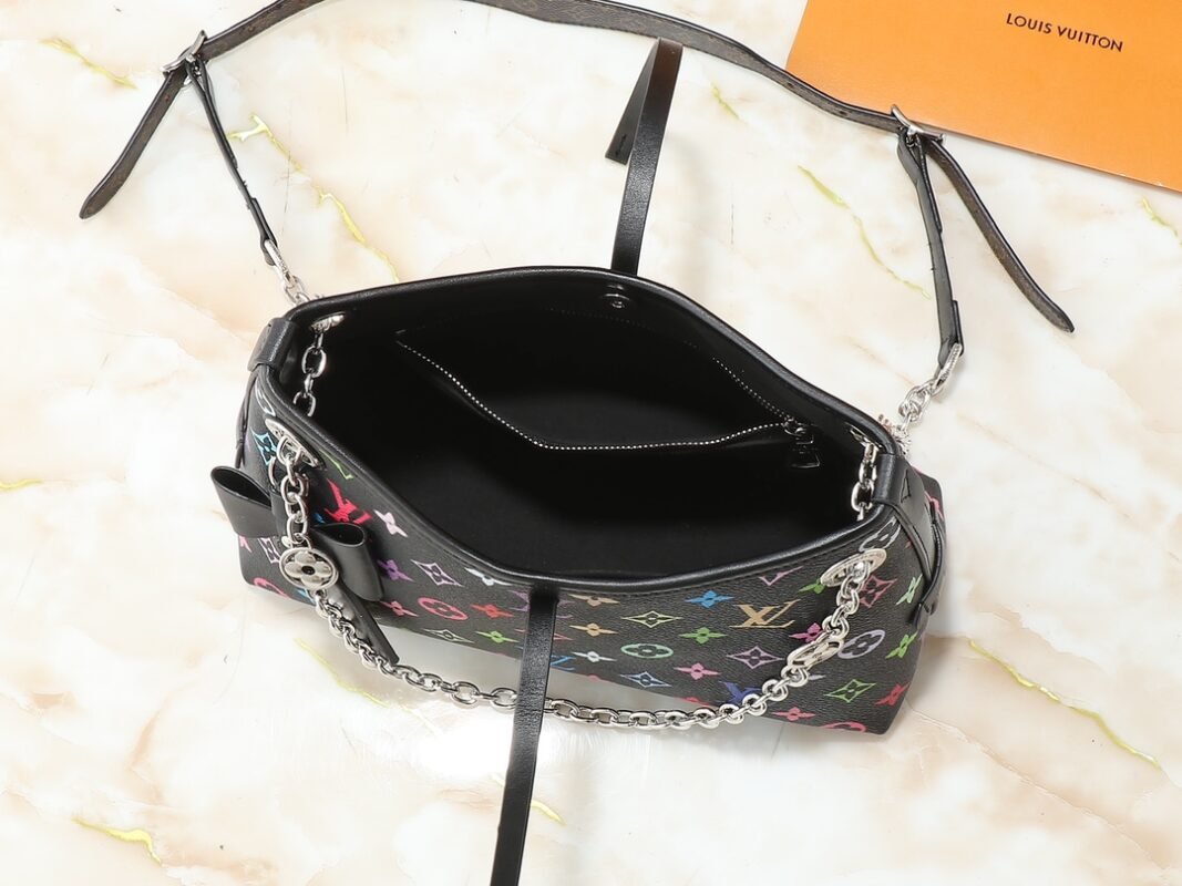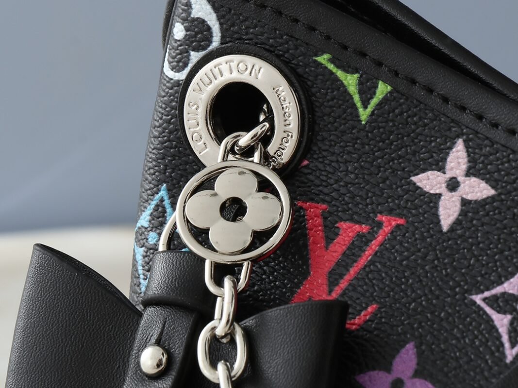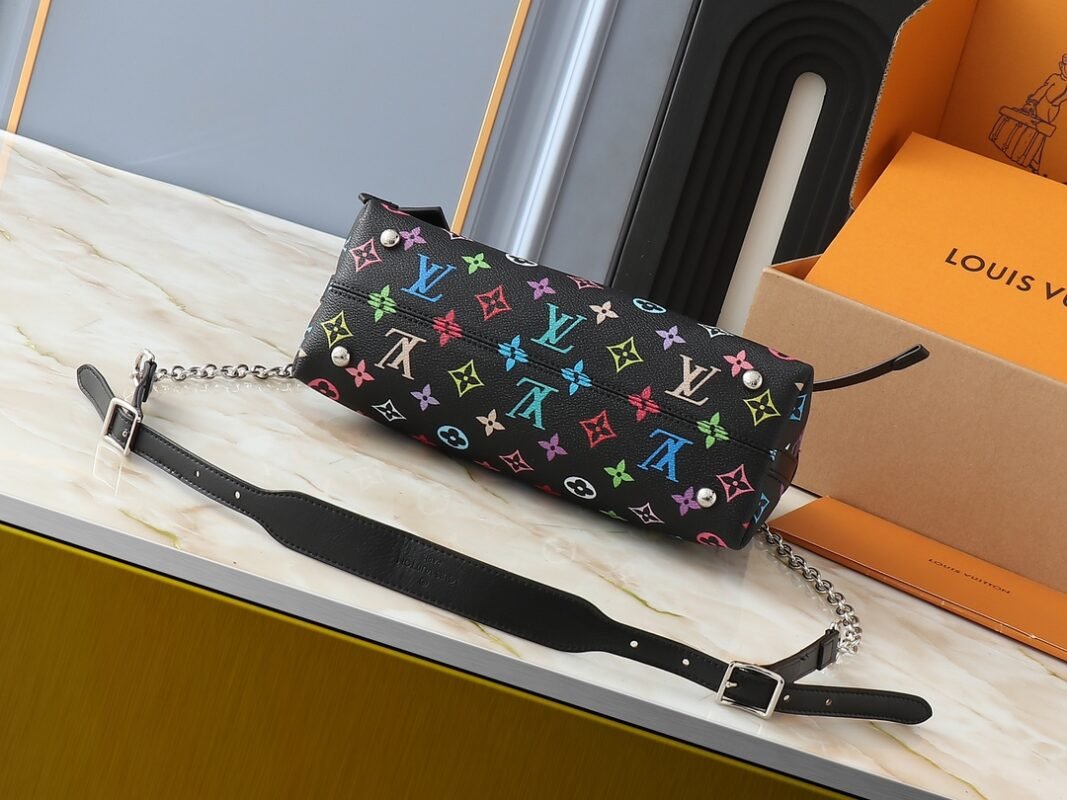 The upgraded M13084 East West Handbag is part of the Louis Vuitton x Takashi Murakami reissue collection, featuring the artist's iconic rainbow hues on the Monogram pattern. Its horizontal design boasts smooth lines, with top handles, decorative side straps, detachable and adjustable shoulder straps, and an LV x TM key pouch, all detailed with cowhide leather, paying homage to the brand's traditional suitcase design. Dimensions: 27.0 x 14.0 x