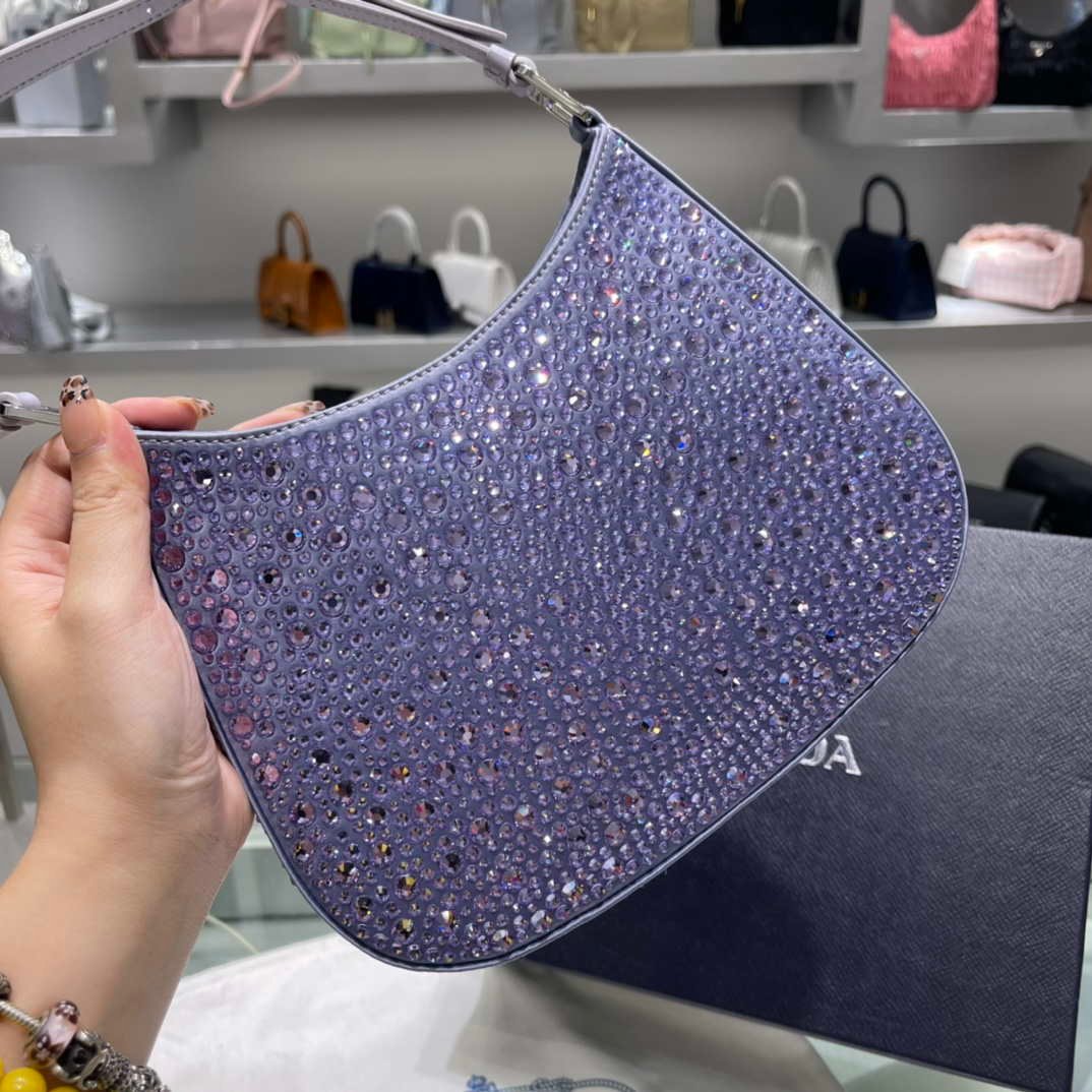 Feminine. elegant and modern. the Prada Cleo bag is made of satin and embellished with luminous crystals of different sizes that give the bag refined charm. The sinuous shape that recalls archive styles makes the accessory iconic.