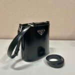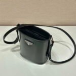 The bucket bag. a recurring design in Prada collections. comes in a mini version with modern allure. decorated with the enameled metal triangle logo and accented with a leather shoulder strap so it can be worn as a cross-body or shoulder bag. Fine brushed leather with its distinctive lustrous finish has been reinterpreted by Prada since the ’90s on unexpected designs for a hybrid result that reflects the duality of the brand.