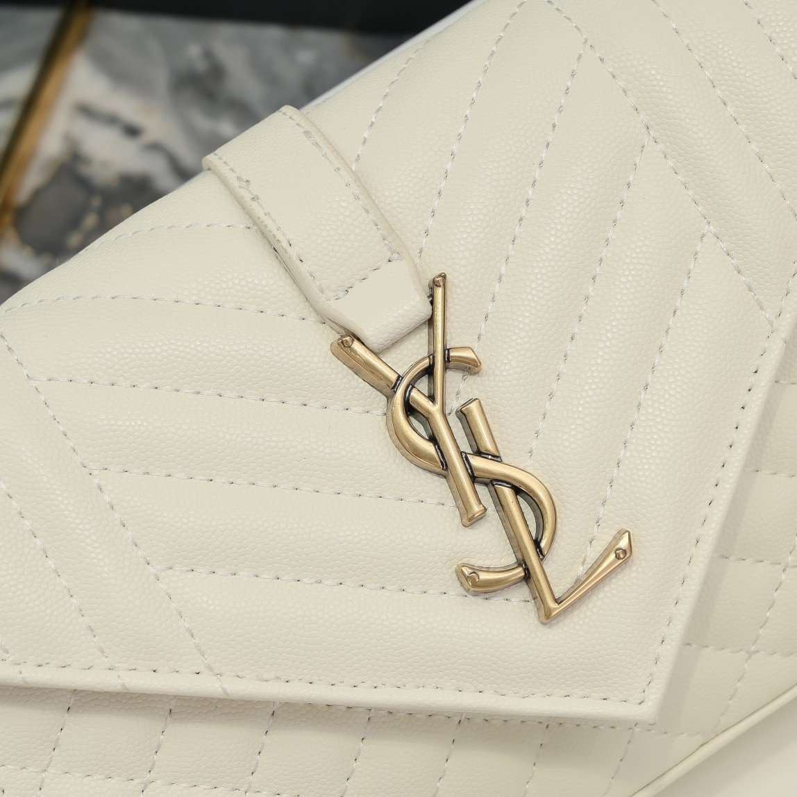 Small size. Envelope# white with gold buckle. Small grained embossed quilted genuine leather envelope bag. Classics are eternal. The V-pattern combined with rhombus pattern of caviar texture is extremely beautiful. It is very wear-resistant. Italian cowhide with a striking Y logo, embodying both elegance and fashion. It is very versatile. The small size has a large capacity. Looking at its side, you can tell it can hold a lot. Model: 52620. Size: 21x13x6cm.