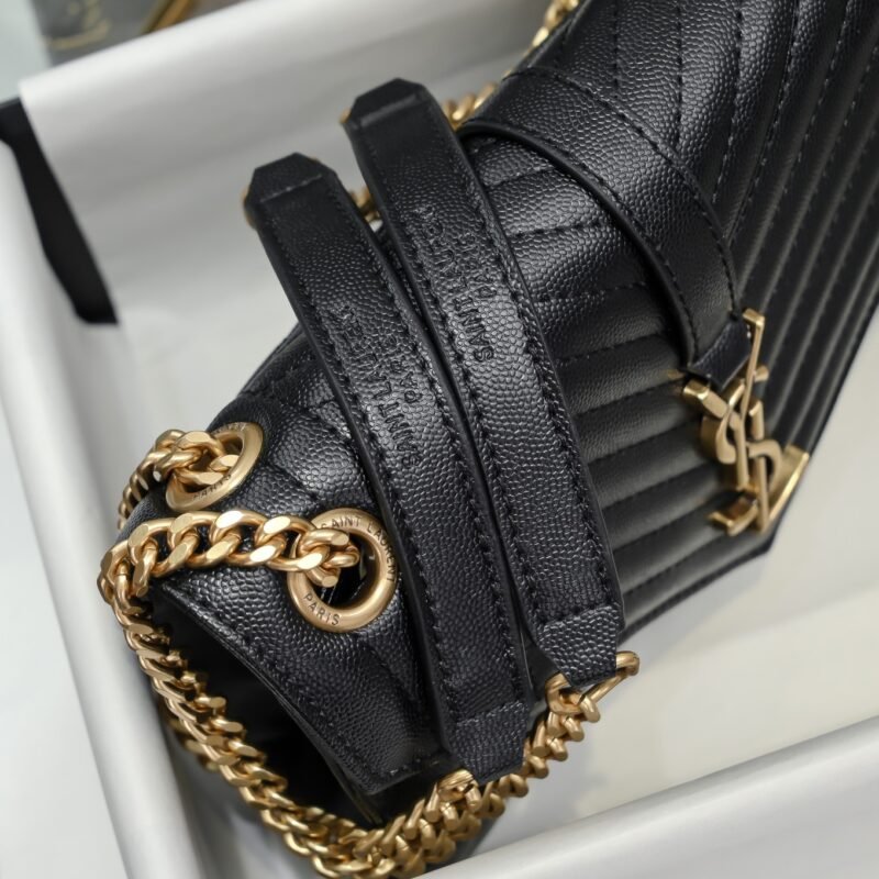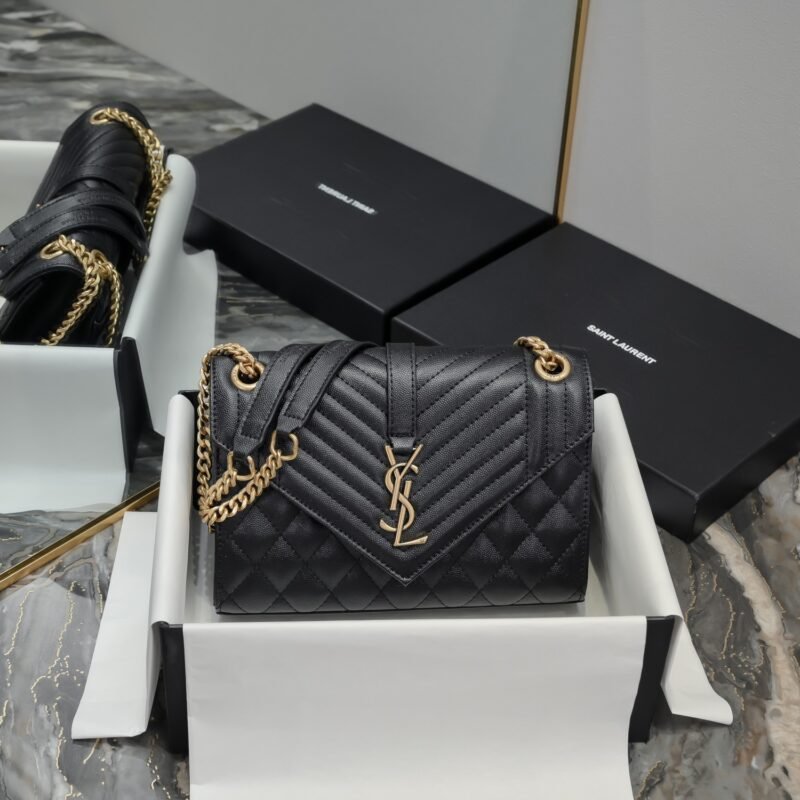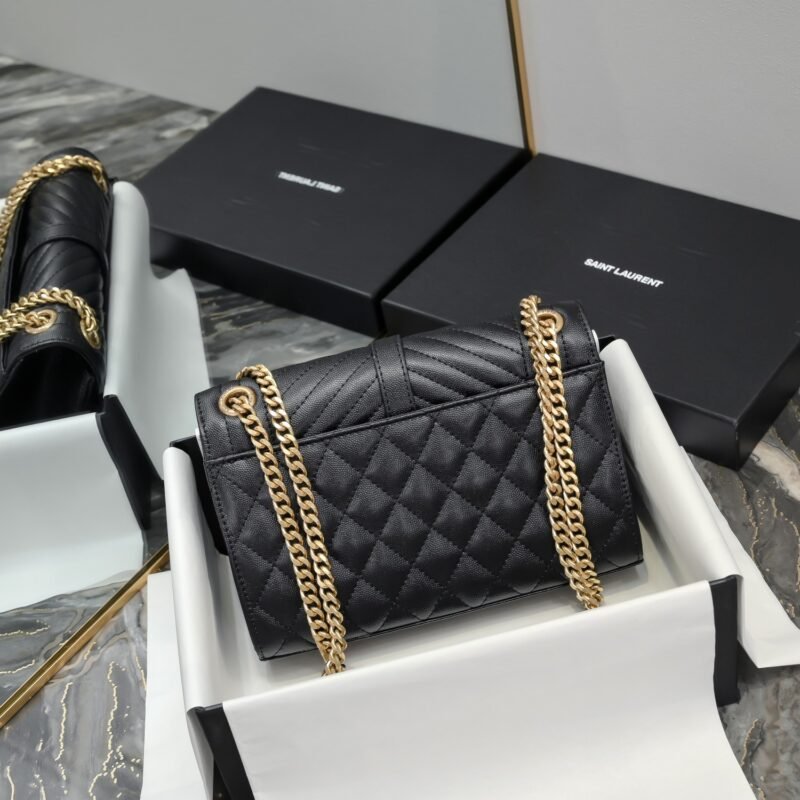 Medium size, Envelope# black with gold buckle. Medium-sized grained embossed quilted genuine leather envelope bag. Classic is eternal. The V pattern combined with rhombus pattern and caviar texture is extremely beautiful. Italian cowhide with a conspicuous Y family logo, integrating elegance and fashion. One chain with three ways to carry: single-chain crossbody, double-chain single-shoulder, and single-chain single-shoulder are all perfect. For fairies of different heights, there is always a carrying method suitable for you. Oh no, it’s the feeling of being enchanted! Model: 48722. Size: 24×17.5x6cm.